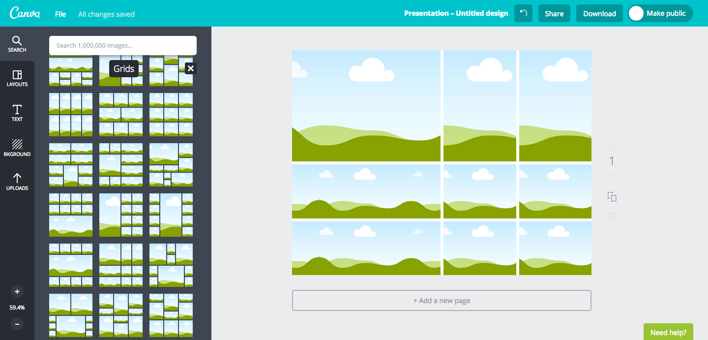 To create a mood board with Canva, start with the presentation template, or you can create a design space using custom dimensions. From here, users can choose a format for their mood board from the grids option, as seen below: