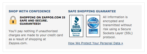 Many ecommerce websites display safe shopping badges, and as long as you have this guarantee and service, it's wise to display it. For example, Zappos shows a lock icon with their "safe shopping guarantee" at the bottom of every product page and also during the checkout process.