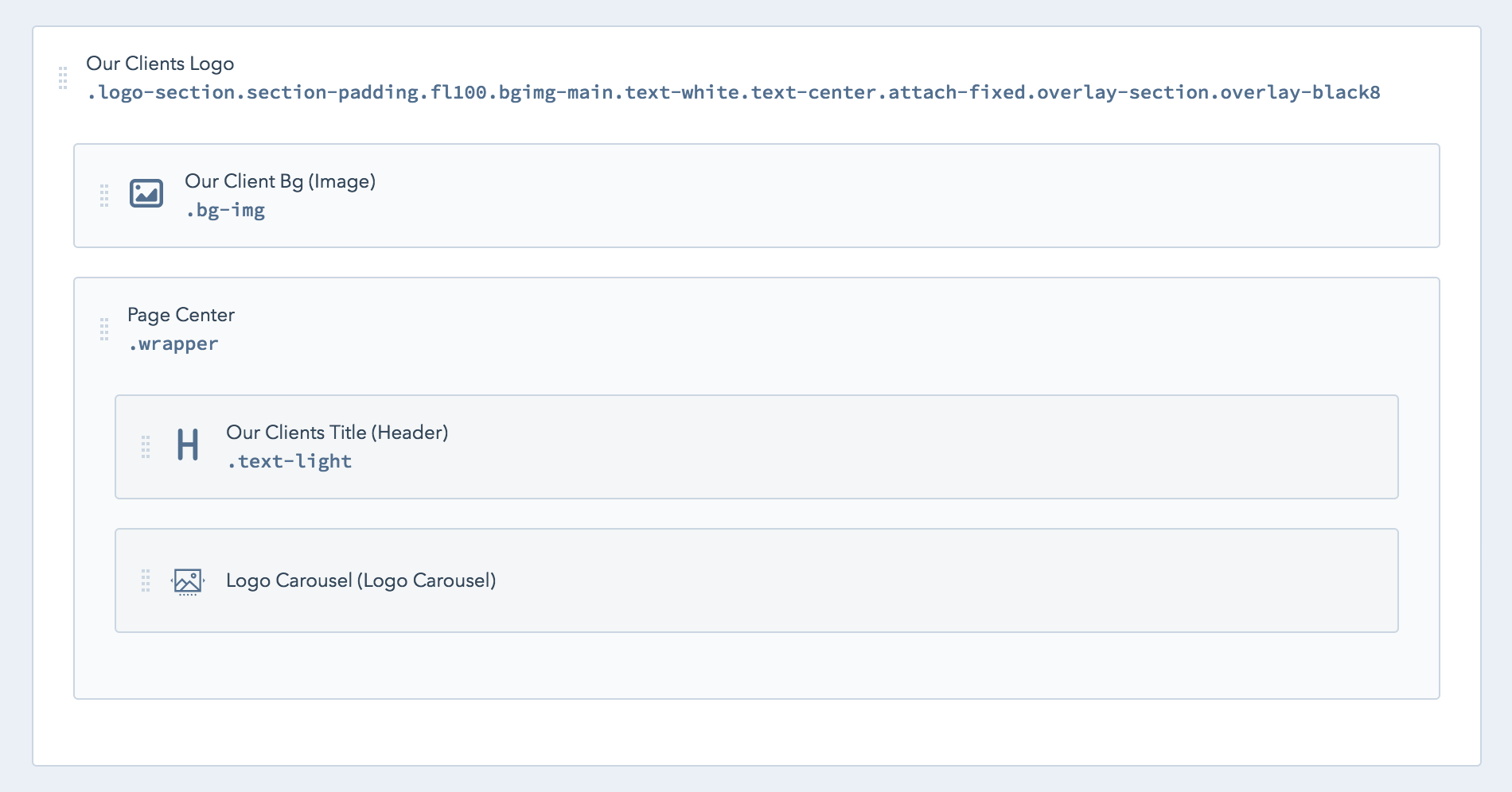 If you're building a template from scratch, this process is just simple drag and drop. In the case of our example, we're replacing a logo carousel that is currently integrated into a fairly complex template. Ideally, we'd like to keep all the styling of this template in place and just swap out the old flex column–based logo carousel with the new module-based logo carousel.